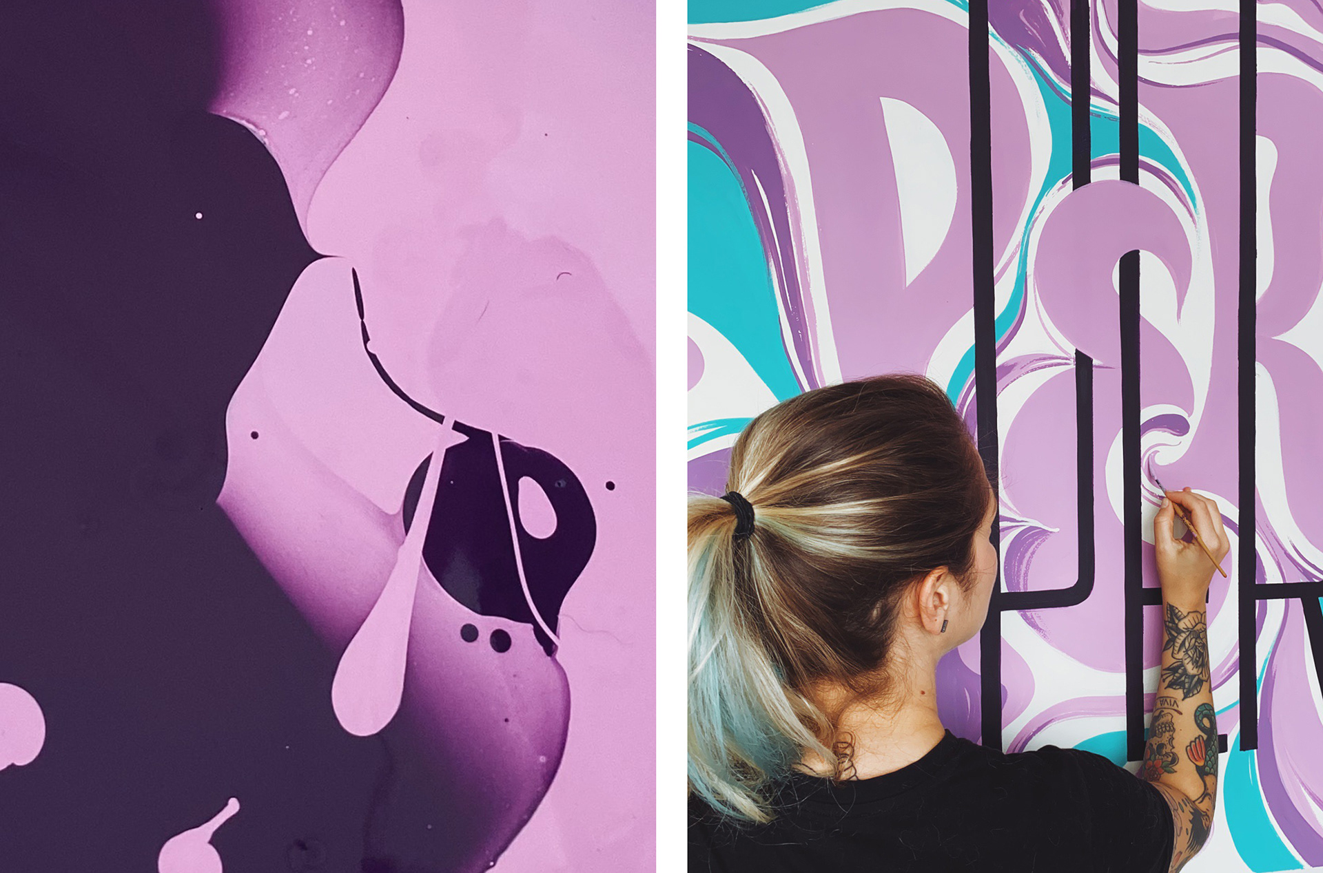 Thinking about all these concepts, I brought this visual expression to an indoor mural where I've worked on a lettering looking like a "prison" – letters extremely measured and fitted into a visual box – for the "PERFECTION" word, representing this obsession to be thin and perfectly aligned to the media and world expectations. In contrast with the expression "PERCEPTION" illustrated in fluid forms inspired by marbling patterns to express our bodies' fluidity and diversity.