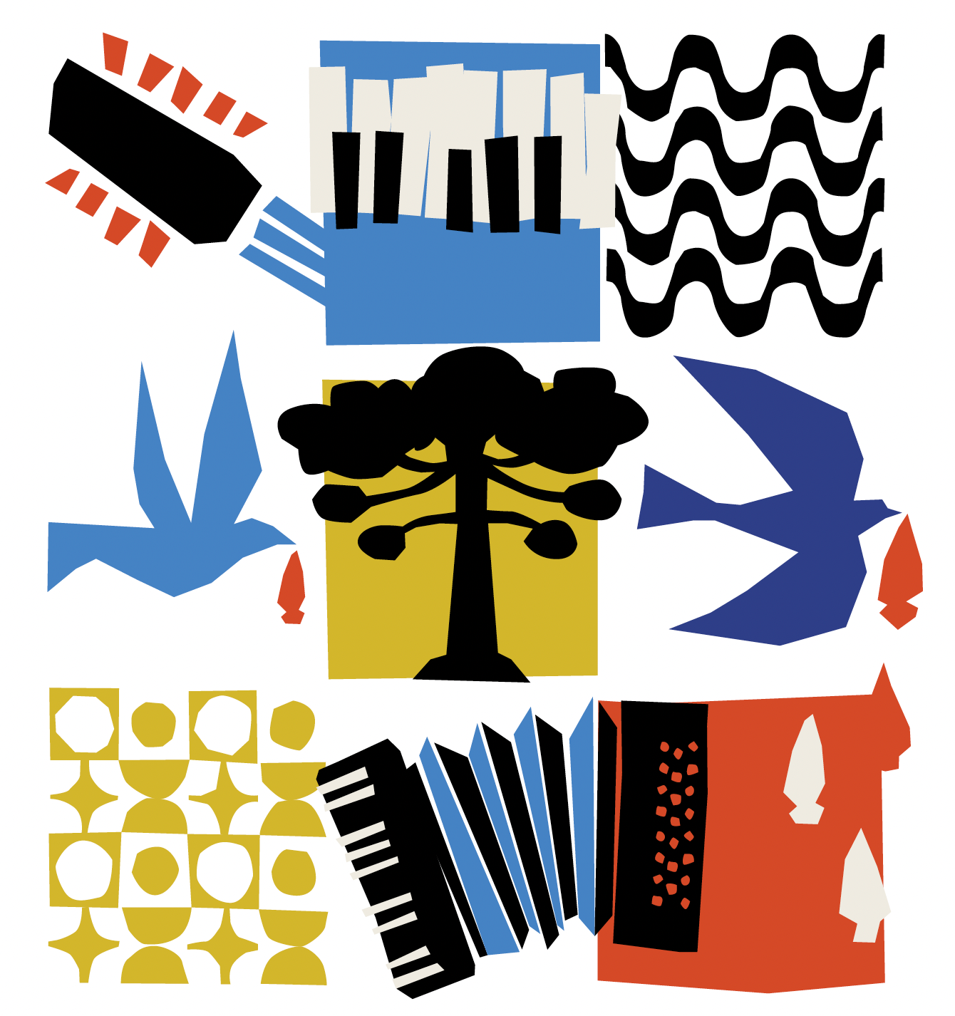 The visual identity was inspired by ceramic tile paintings by artist Poty Lazzarotto, depicting three azure jays carrying pine nuts — seeds that help spread the Araucaria trees across the region. The aesthetic also draws from cut-paper art, with irregular lines and asymmetrical shapes, evoking school projects of cutting and pasting, and creating a direct connection with the children’s audience and the educational context of the project.